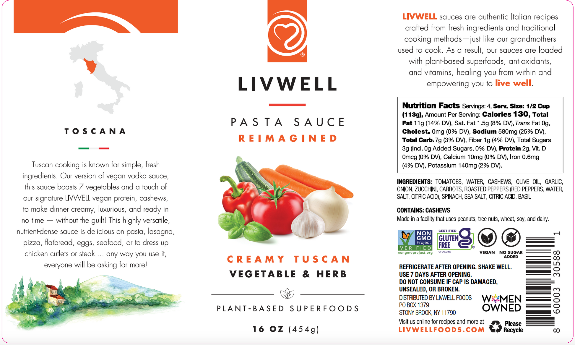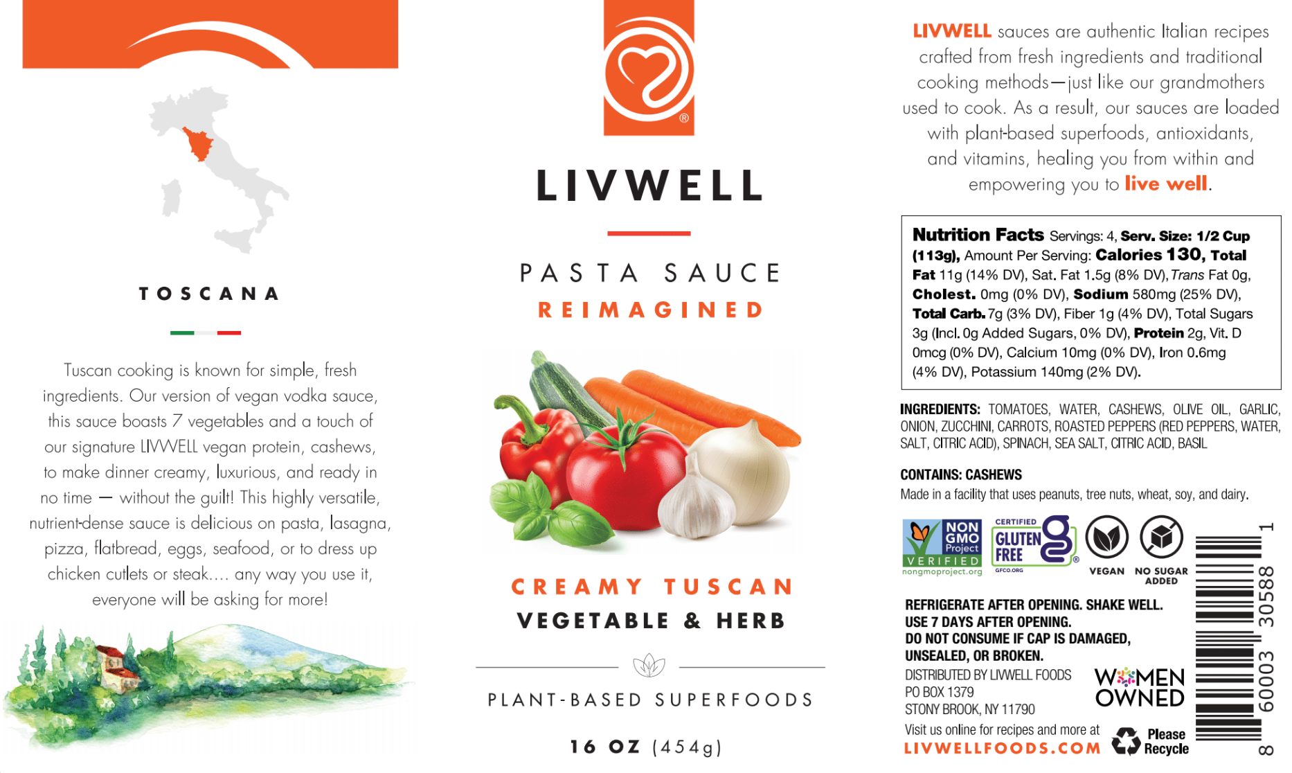 Tuscan cooking is known for simple, fresh ingredients. Our version of a vegan vodka sauce, this sauce boasts 7 vegetables and a touch of our signature LIVWELL vegan protein (cashews) to make dinner creamy, luxurious, and ready in no time - without the guilt! This highly versatile, nutrient-dense sauce is delicious on pasta, lasagna, pizza, flatbread, eggs, seafood, or to dress up chicken cutlets or steak.... any way you use it, everyone will be asking for more!