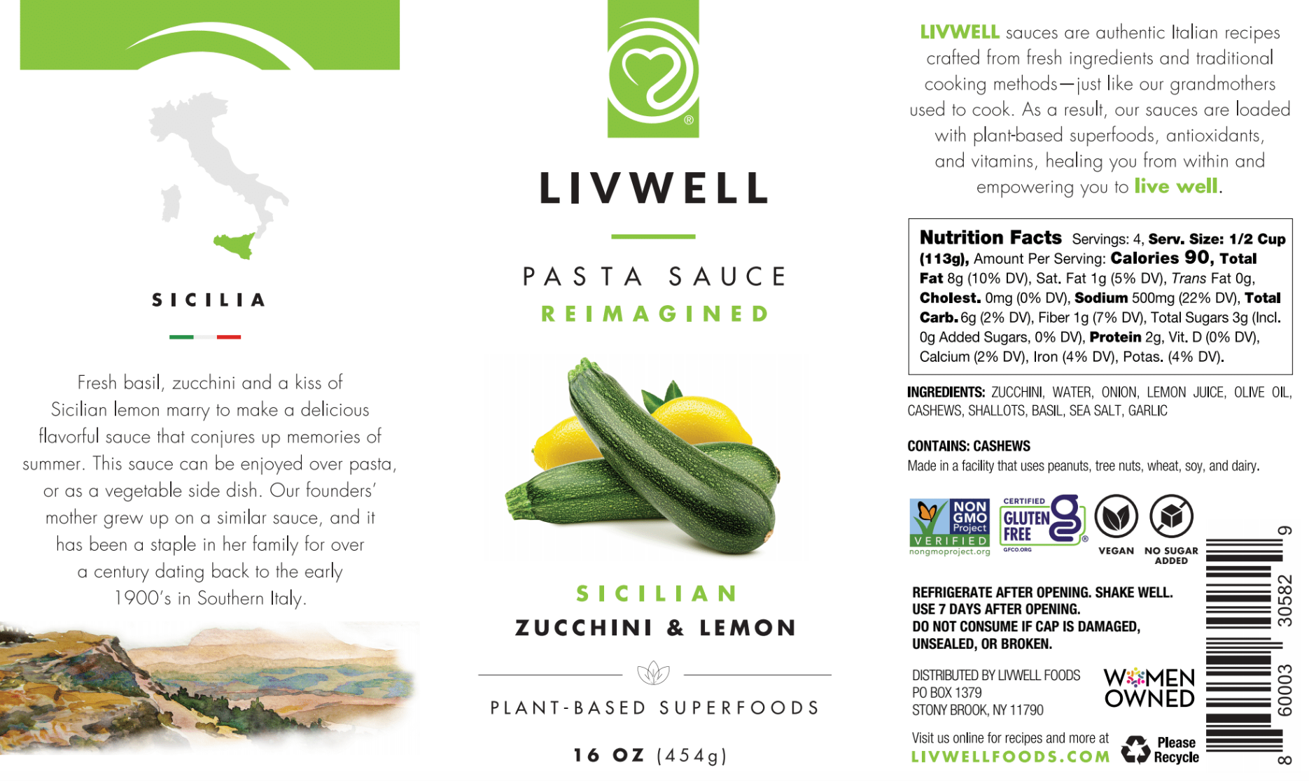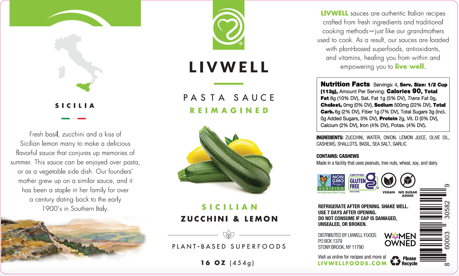 Fresh basil, zucchini and a kiss of Sicilian lemon marry to make a delicious flavorful sauce that conjures up memories of summer.  This sauce can be enjoyed over pasta or as a vegetable side dish.  Our founders’ mother grew up on a similar sauce and has been a staple in her family for over a century dating back to early 1900’s in Southern Italy.